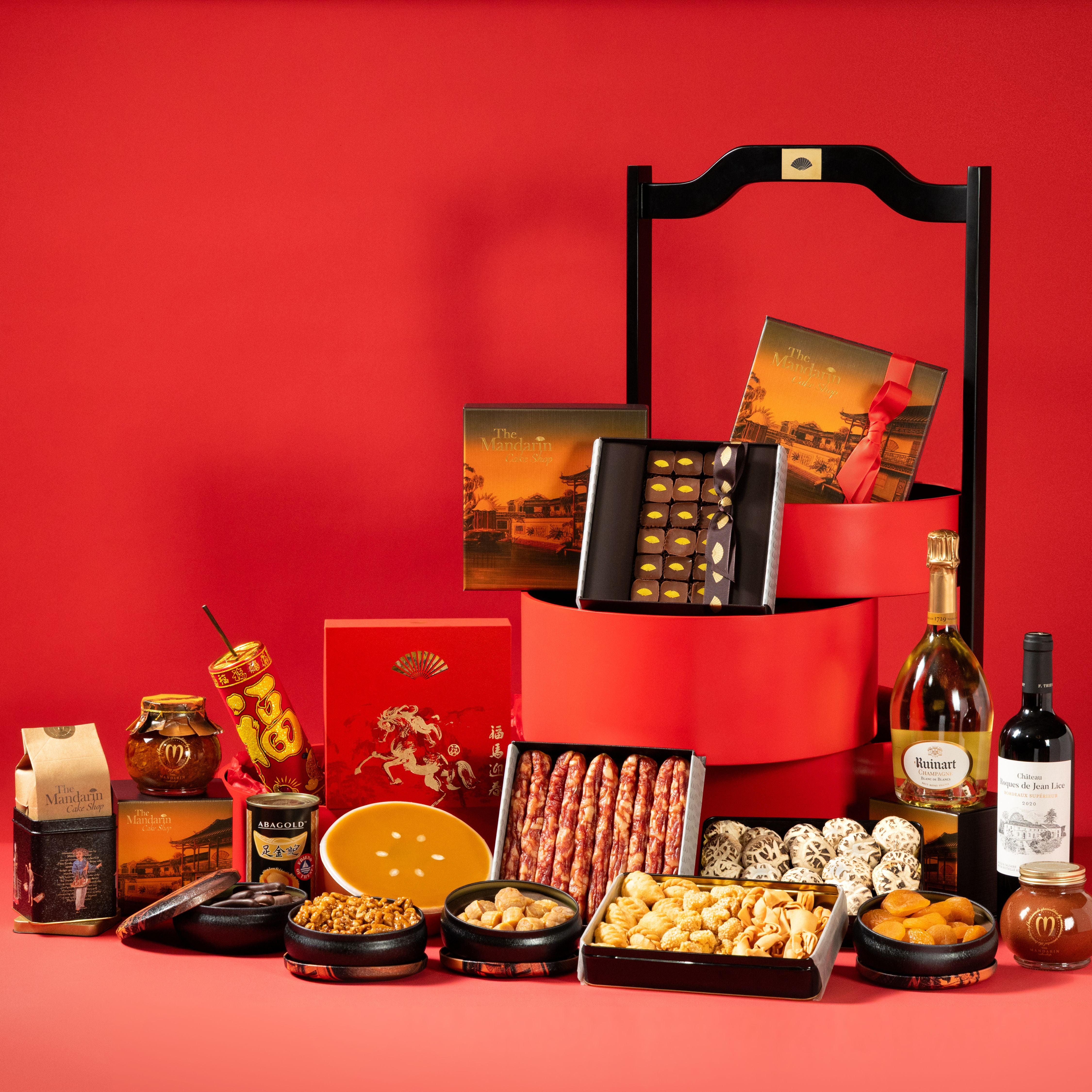 Ruinart Blanc de Blancs NV Champagne 750ml, Chateau Roques de Jean Lice, Bordeaux, France 750ml, Glutinous Rice Cake 1kg, Chinese Cookies 330g, Chocolate Pavé 18pcs, Chocolate coated Orange and Ginger Peel 150g, Chocolate Golden Coins 150g, Caramelised Walnuts 150g, Mandarin Oriental Homemade X.O. Sauce 330g, The Mandarin Cake Shop's Signature Rose Petal Jam 360g, Abalone 213g, Chinese Preserved Sausages 450g, Conpoy 145g, Dried Mushroom 200g, Dried Apricot 150g, Chinese Candy Box 300g, Oolong Tea 120g