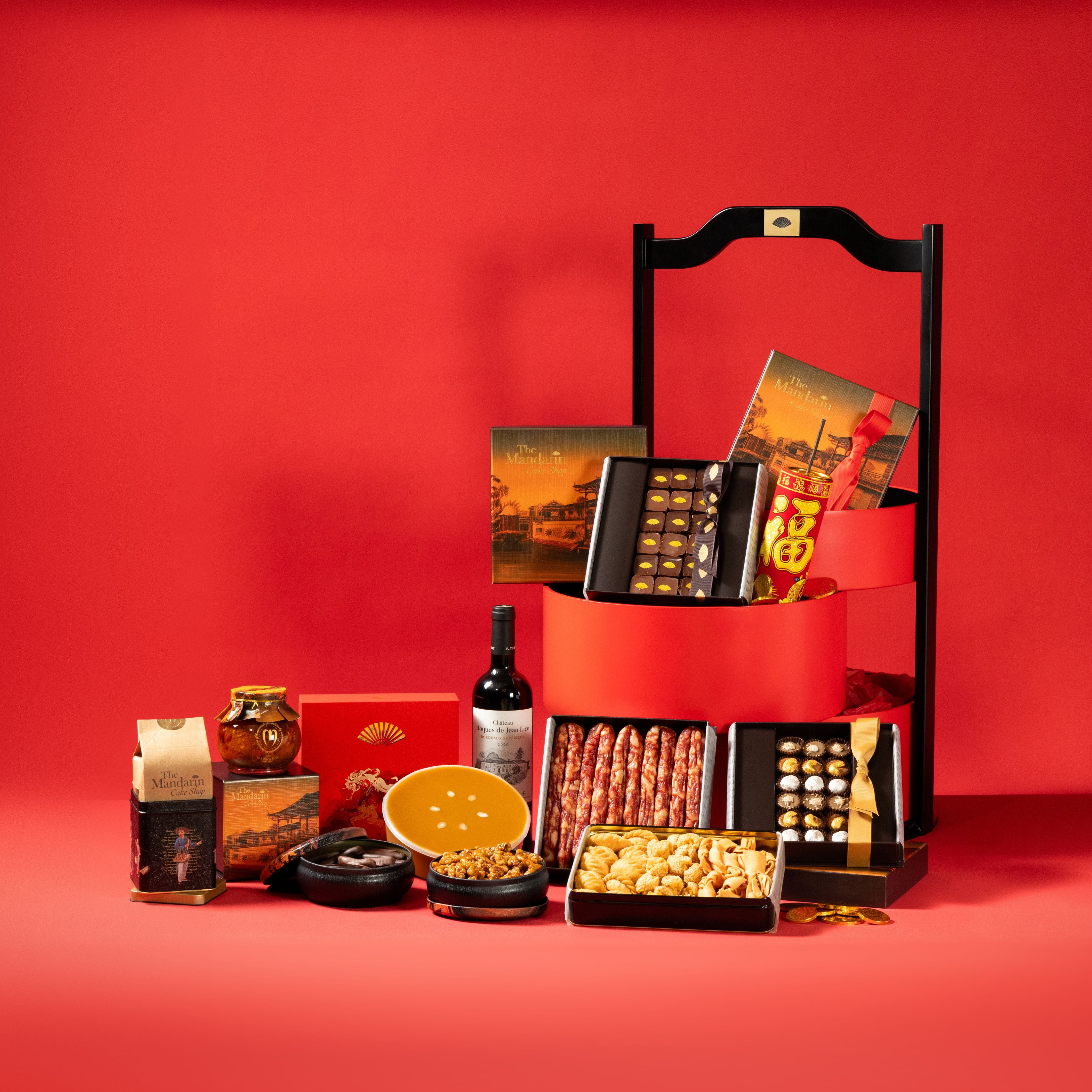 Chateau Roques de Jean Lice, Bordeaux, France 750ml, Glutinous Rice Cake 1kg, Chinese Cookies 330g, Assorted Chinese New Year Praline Collection 18pcs, Chocolate Pavé 18pcs, Chocolate Coated Orange and Ginger Peel 150g, Chocolate Golden Coins 150g, Caramelised Walnuts 150g, Mandarin Oriental Homemade X.O. Sauce 330g, Chinese Preserved Sausages 450g, Chinese Candy Box 300g, Oolong Tea 120g